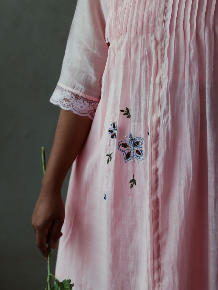 A soft blush color kurta set with pintuck detailing and floral embroidery. Finished with lace accents for a feminine, graceful look.