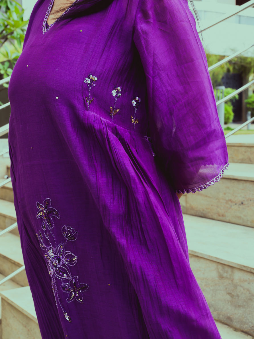 A royal purple kurta set with delicate hand embroidery and relaxed pleated styling. Paired with matching straight pants for timeless elegance.